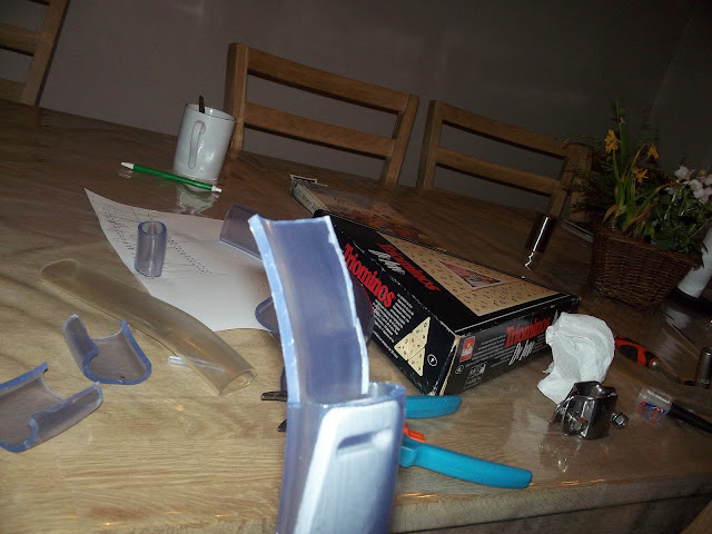Jeg kørte i Bauhaus og købte 4 meter 1 1/4 tommer klar plastslange til 35 kr. pr m. Der skal bruges knap 1 m pr bøjle.